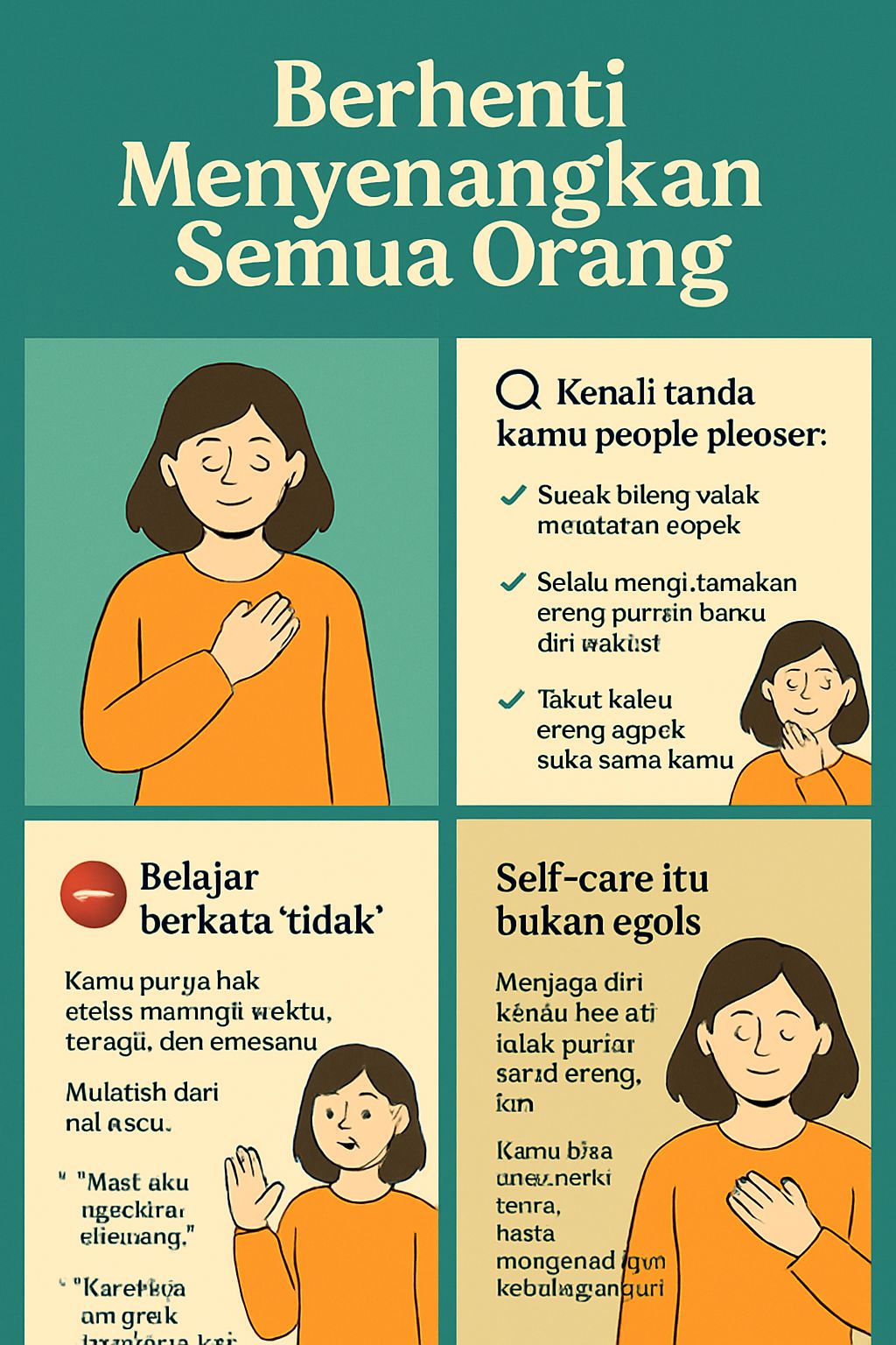 Setelah mengenali polanya, langkah berikutnya adalah belajar berkata “tidak” tanpa merasa bersalah. Kita memiliki hak untuk melindungi waktu, tenaga, dan kesehatan mental. Awali dari hal-hal kecil seperti berkata, “Maaf, aku nggak bisa sekarang,” atau “Aku butuh istirahat dulu.” Semakin sering kita berlatih, semakin mudah bagi kita untuk menjaga diri dari tuntutan yang berlebihan.