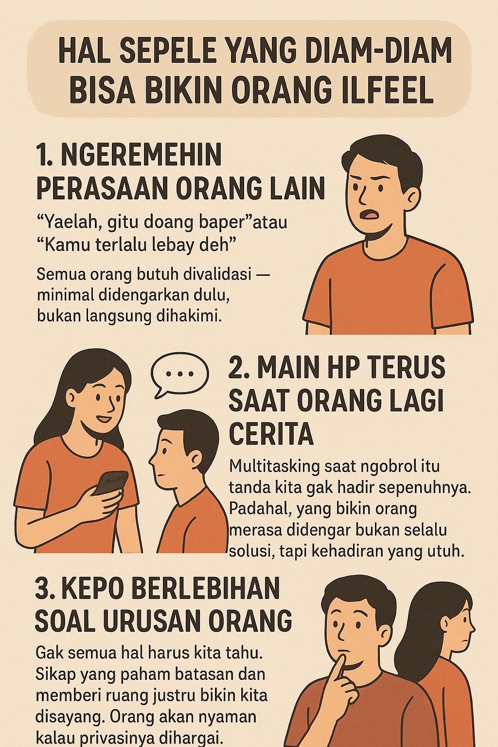 1. Ngeremehin Perasaan Orang Lain Kalimat seperti “Yaelah, gitu doang baper” atau “Kamu terlalu lebay deh” bisa bikin orang langsung menarik diri. Semua orang butuh divalidasi, minimal didengarkan dulu, bukan langsung dihakimi. Transisi: Jadi, hati-hati dengan kata-kata yang meremehkan.